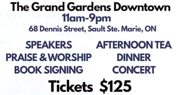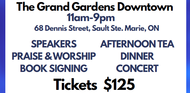 Join us Saturday, November 7, 2026 for an all day event at the Grand Gardens Downtown, 68 Dennis Street, Sault Ste. Marie, ON. Salt and Light's first ever of what we hope will become an annual event. Doors open at 10 am, conference runs from 11am- 9pm. We will have praise & worship, speakers, book signing, lunch and dinner and close with a music concert.